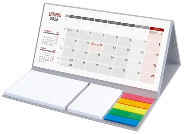 Wygodny kalendarz stojący na biurko z przejrzystym kalendarium w układzie miesięcznym z poręcznymi karteczkami samoprzylepnymi do notowania. Przydatny zwłaszcza w biurze. W kalendarzu zaznaczono święta.