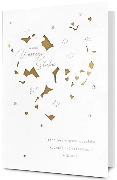 Kartka jest bogato i różnorodnie zdobiona (zależnie od wzoru: metaliczna folia, lakier perłowy,