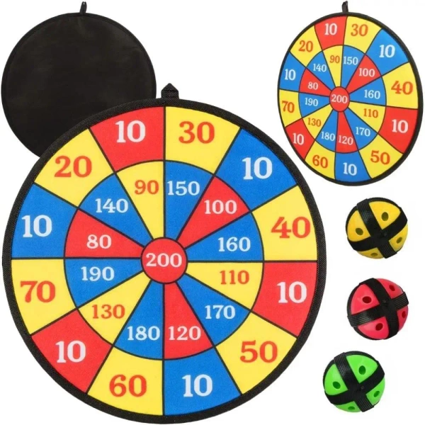 Tarcza do Darta na Rzepy z Piłkami - Bezpieczna i Wciągająca Zabawa! Przedstawiamy fantastyczną tarczę do darta z piłkami na rzepy, która gwarantuje bezpieczną i pełną emocji rozrywkę dla dzieci i całej rodziny! Zapomnij o ostrych lotkach - dzięki miękkim piłkom, które przyczepiają się do tarczy za pomocą rzepów, zabawa jest w pełni bezpieczna i niezwykle wciągająca. Cechy produktu: Maksymalne bezpieczeństwo: Miękkie piłki pokryte rzepami eliminują ryzyko skaleczeń, co czyni tę tarczę idealną zabawką dla najmłodszych. Tarcza: Tarcza ma klasyczny układ do darta Kolorowy i atrakcyjny design: Jasne, żywe kolory tarczy przyciągają wzrok i zachęcają do zabawy. Duże, czytelne liczby ułatwiają liczenie punktów. W zestawie 3 piłek: Dołączone 3 plastikowe piłki z rzepami w różnych kolorach (żółty, czerwony, zielony) pozwalają na zabawę w większym gronie. Łatwe zawieszenie i przechowywanie: Lekka konstrukcja tarczy oraz praktyczny uchwyt umożliwiają łatwe zawieszenie jej w dowolnym miejscu. Po zabawie tarczę można łatwo zdjąć i schować. Rozwija koordynację i celność: Rzucanie piłkami do celu wspomaga rozwój koordynacji wzrokowo-ruchowej, precyzji i umiejętności motorycznych. Świetna zabawa dla całej rodziny: To doskonała gra, która angażuje wszystkich domowników, zapewniając wspólną rozrywkę i zdrową rywalizację. Wielkość : 36cm Idealna na prezent: Tarcza do darta na rzepy to świetny pomysł na prezent dla dzieci w różnym wieku. Ten bezpieczny i kolorowy zestaw do darta na rzepy to gwarancja udanej zabawy bez obaw! Idealny do domu, ogrodu czy na wyjazdy.