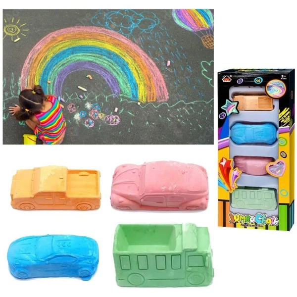 Jumbo Chalk - Kreda Uliczna w Kształcie Pojazdów - 4 Sztuki Odkryj kreatywną zabawę na świeżym powietrzu z naszym zestawem Jumbo Chalk! Te wyjątkowe kredy chodnikowe mają kształt uroczych pojazdów, co sprawia, że rysowanie na chodniku, asfalcie czy tablicy staje się jeszcze bardziej ekscytujące. Kluczowe cechy produktu: Kreda w kształcie pojazdów: Zestaw zawiera 4 duże kredy w kształtach popularnych pojazdów: samochodu osobowego, pickupa, autobusu i [proszę sprawdzić, jaki jest czwarty pojazd na zdjęciu, jeśli jest rozpoznawalny]. Duży rozmiar: Kredy są duże i wygodne do trzymania przez małe rączki, co ułatwia rysowanie dużych obrazków i detali. Żywe kolory: Intensywne i nasycone kolory kredy sprawiają, że rysunki są wyraziste i przyciągają wzrok. Łatwo zmywalna: Rysunki wykonane tą kredą łatwo zmyć wodą, co pozwala na niekończącą się zabawę i tworzenie nowych dzieł. Bezpieczna dla dzieci: Kreda jest nietoksyczna i bezpieczna dla dzieci powyżej 3 roku życia. Rozwija kreatywność i wyobraźnię: Rysowanie kredą na świeżym powietrzu pobudza wyobraźnię, rozwija zdolności artystyczne i motorykę małą. Świetna zabawa na zewnątrz: Idealna do zabawy na chodniku, podjeździe, placu zabaw czy szkolnym boisku. Zawartość zestawu: 4 x Jumbo Chalk w kształcie pojazdów (samochód osobowy, pickup, autobus, [czwarty pojazd]) Wielkość 13x30x4 cm Podaruj swojemu dziecku mnóstwo radości i kreatywnej zabawy na świeżym powietrzu z naszymi kredami Jumbo Chalk w kształcie pojazdów! Niech chodniki ożyją kolorowymi rysunkami!