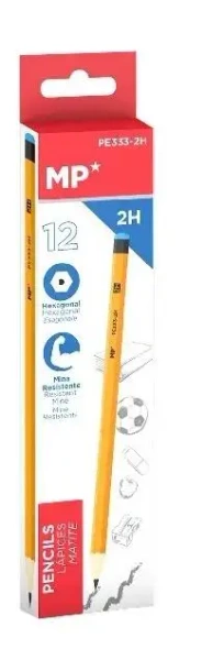 Grafitowy ołówek z drewnianym korpusem lakierowanym na żółto. Sześciokątny korpus. Końcówki w różnych kolorach dla zróżnicowania twardości ołowiu. Ołów odporny na wstrząsy i ostrzenie.Twardość 2H (twarda) wskazana na rysunku technicznym. Pozostaw znak podczas kasowania.Niebieski koniec. Rozmiar 180 mm.