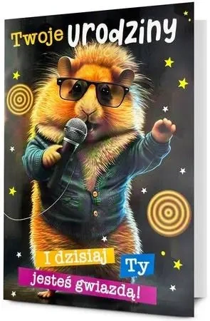 Kartka jest zdobiona opalizującą folią holograficzną, zawiera życzenia i kolorowy środek. W zestawie znajduje się koperta, kolorystycznie uzupełniająca się z kartką.