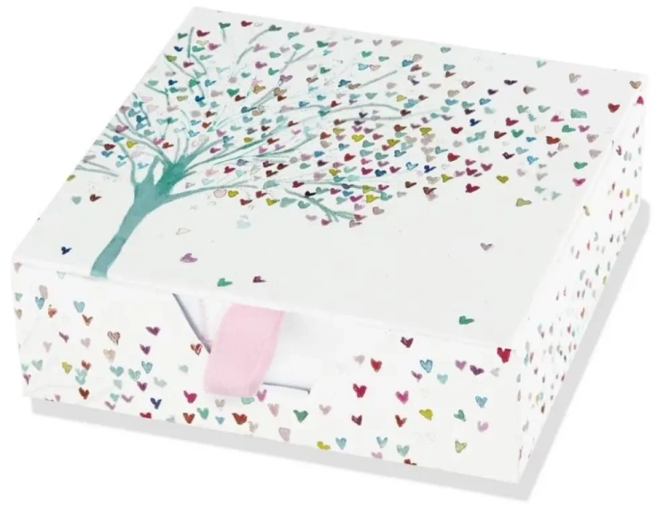 Zdobione 250 karteczek do zapisków, pakowane w eleganckie pudełko z wstążką, zamykane na magnes. Karteczka o wymiarze 10 x 10 cm.