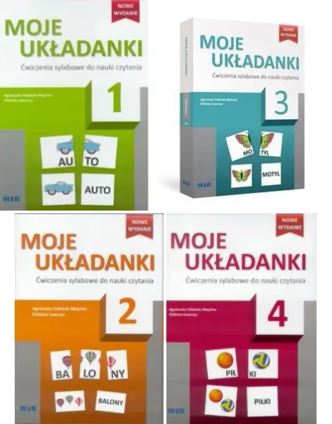 MOJE UKŁADANKI to pomoc edukacyjna dla dzieci uczących się czytać. Polecana jest także dla dzieci z grupy ryzyka dysleksji. Zestaw zawiera materiał podzielony zgodnie z kolejnymi etapami symultaniczno- sekwencyjnej metody wczesnej nauki czytania prof. Jagody Cieszyńskiej. Jest uzupełnieniem serii MOJE SYLABKI i pozwala na zwielokrotnienie ćwiczeń, co jest niezbędne w nauce czytania. Układanki są skonstruowane tak, aby w formie zabawy wykorzystać wszystkie możliwości dziecka.