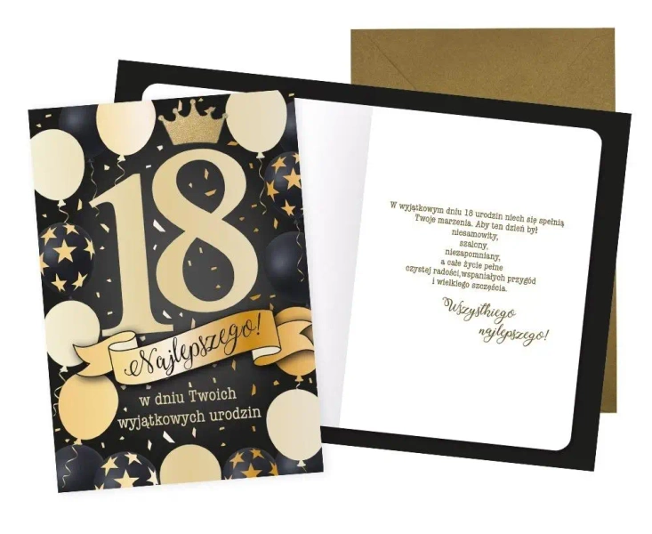Kartka Dream Cards na Osiemnastkę "Najlepszego" DK-1287 Kartka B6 z ozdobnej serii Dream Cards - nieduża, ale robi wrażenie dzięki atrakcyjnej kolorystyce i ciekawym zdobieniom. To idealny wybór łączący przyjazną cenę z jakością. Cechy szczególne: wielkość: B6, 16.6 x 11.7 cm po złożeniu, koperta: w zestawie, kolorowa, zdobienia: kolorowe, różnorodne, bogate (w zależności od wzoru: przyklejane dekoracje, elementy biżuteryjne, odstawniki, metaliczne folie, tłoczenia itp.), okazja: osiemnastka, urodziny