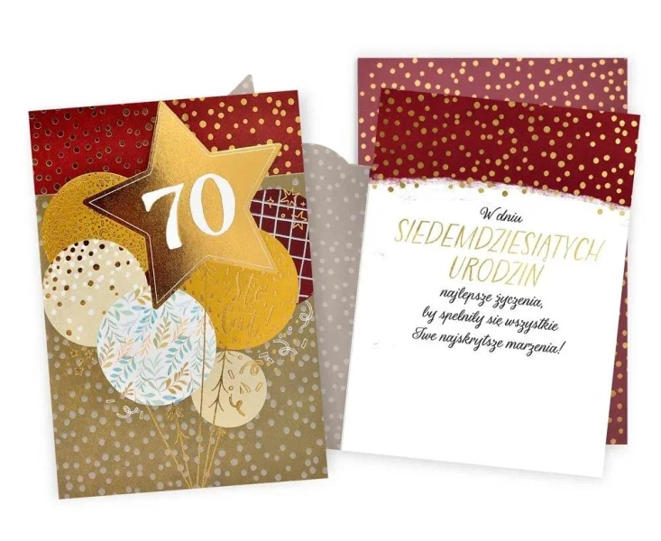 Kartka Dream Cards "Urodziny 70" DK-1255 Kartka B6 z ozdobnej serii Dream Cards - nieduża, ale robi wrażenie dzięki atrakcyjnej kolorystyce i ciekawym zdobieniom. To idealny wybór łączący przyjazną cenę z jakością. Cechy szczególne: wielkość: B6, 16.6 x 11.7 cm po złożeniu, koperta: w zestawie, kolorowa, zdobienia: kolorowe, różnorodne, bogate (w zależności od wzoru: przyklejane dekoracje, elementy biżuteryjne, odstawniki, metaliczne folie, tłoczenia itp.), okazja: urodziny