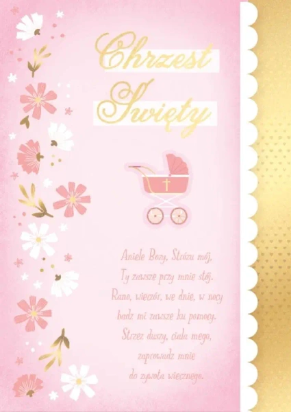 Kartka Dream Cards na Chrzest DK-1301 Kartka B6 z ozdobnej serii Dream Cards - nieduża, ale robi wrażenie dzięki atrakcyjnej kolorystyce i ciekawym zdobieniom. To idealny wybór łączący przyjazną cenę z jakością. Cechy szczególne: wielkość: B6, 16.6 x 11.7 cm po złożeniu, koperta: w zestawie, kolorowa, zdobienia: kolorowe, różnorodne, bogate (w zależności od wzoru: przyklejane dekoracje, elementy biżuteryjne, odstawniki, metaliczne folie, tłoczenia itp.), okazja: Chrzest