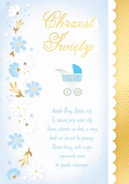 Kartka Dream Cards na Chrzest DK-1302 Kartka B6 z ozdobnej serii Dream Cards - nieduża, ale robi wrażenie dzięki atrakcyjnej kolorystyce i ciekawym zdobieniom. To idealny wybór łączący przyjazną cenę z jakością. Cechy szczególne: wielkość: B6, 16.6 x 11.7 cm po złożeniu, koperta: w zestawie, kolorowa, zdobienia: kolorowe, różnorodne, bogate (w zależności od wzoru: przyklejane dekoracje, elementy biżuteryjne, odstawniki, metaliczne folie, tłoczenia itp.), okazja: Chrzest