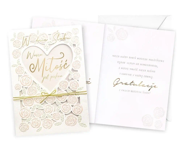 Kartka Dream Cards na Ślub DK-1322 Kartka B6 z ozdobnej serii Dream Cards - nieduża, ale robi wrażenie dzięki atrakcyjnej kolorystyce i ciekawym zdobieniom. To idealny wybór łączący przyjazną cenę z jakością. Cechy szczególne: wielkość: B6, 16.6 x 11.7 cm po złożeniu, koperta: w zestawie, kolorowa, zdobienia: kolorowe, różnorodne, bogate (w zależności od wzoru: przyklejane dekoracje, elementy biżuteryjne, odstawniki, metaliczne folie, tłoczenia itp.), okazja: Ślub