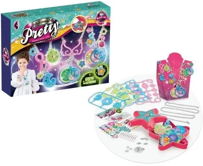 Odkryj magię tworzenia z zestawem "Pretty - Do it yourself! Enjoy your life". Ten kompleksowy zestaw DIY to zaproszenie do świata brokatowej biżuterii, która zaskakuje swoim blaskiem nawet po zgaszeniu światła. W pudełku znajdziesz wszystko, czego potrzeba do stworzenia fantastycznych naszyjników i bransoletek - od form, przez łańcuszki i zawieszki, po specjalne brokatowe proszki i elementy świecące w ciemności. Proces tworzenia jest prosty i intuicyjny, co pozwala dzieciom na samodzielne eksperymentowanie i rozwijanie kreatywności. Zestaw "Pretty" to nie tylko gwarancja godzin wspaniałej zabawy, ale także doskonały sposób na rozwijanie zdolności manualnych, precyzji i wyobraźni. Stwórz swoją wymarzoną biżuterię, która podkreśli Twój styl i zachwyci wszystkich niezwykłym efektem świecenia w ciemności. Idealny na prezent, który z pewnością wywoła uśmiech na każdej twarzy.
