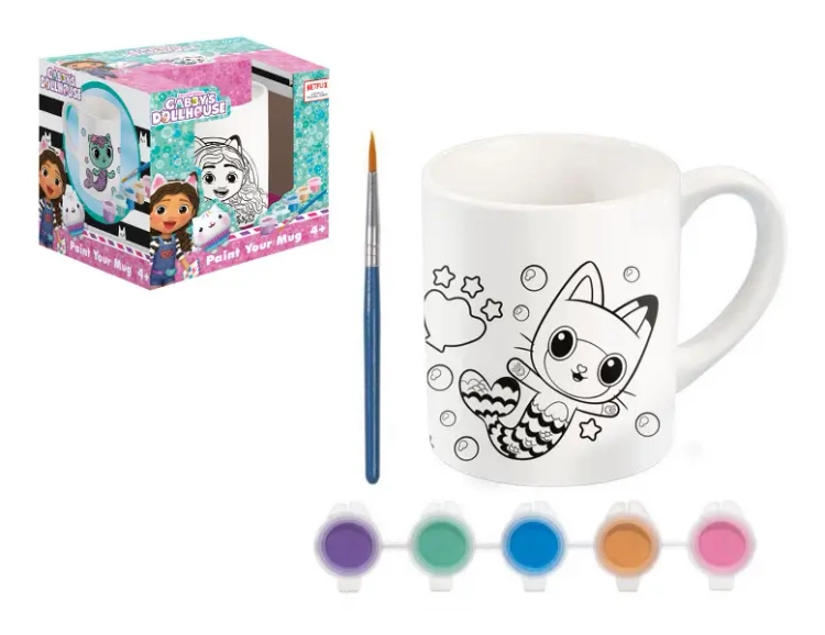 Malowanie kubków - pomaluj kubek z motywem Gabby według własnego uznania.&&W zestawie: ceramiczny kubek, pędzel, 5 kolorów i instrukcja użytkowania.&&Sposób użycia: W zestawie znajdują się specjalne farby do ceramiki. Czas schnięcia: 24 godziny. Po malowaniu umyj ręce. Piec w temperaturze 150 stopni C. Cały proces musi być nadzorowany przez osobę dorosłą.