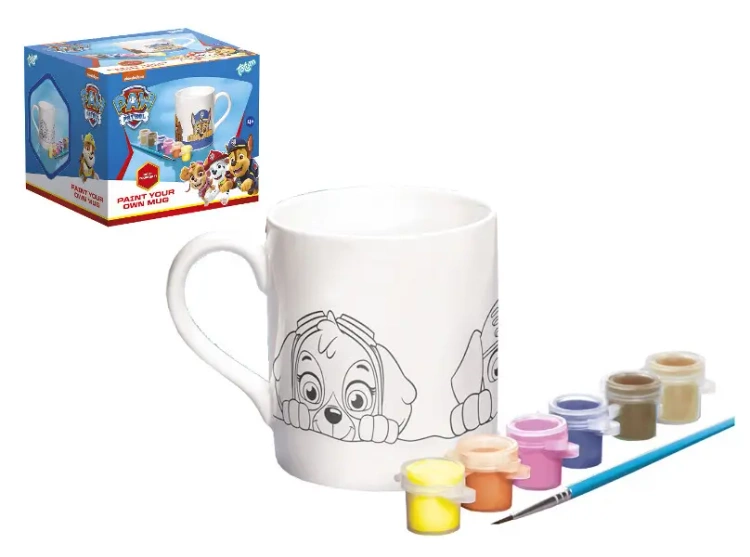 Ceramiczny kubek z nadrukowanymi rysunkami do pokolorowania, 5 kolorów farb oraz pędzelek. Zestaw zapakowany w estetyczne, kolorowe pudełko. Idealny pomysł na upominek dla dzieci.
