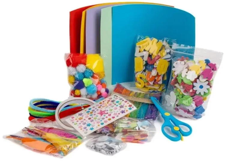 duży zestaw kreatywny, zawiera twardy papier, nożyczki, taśmę dwustronną, pompony, piórka, piórka, drewka, guziki, druciki, naklejki piankowe - litery, kwiaty, zwierzęta, samoprzylepne ruchome oczka, samoprzylepne diamenciki, cekiny