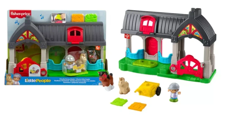 Fisher-Price Little People Stajnia Przyjazne koniki Zestaw z dźwiękami Zabawkowa stajnia z odgłosami, konikami zabawkami i akcesoriami dla dzieci od 1 roku życia nbsp Maluchy mogą pogalopować ku niesamowitym przygodom w zestawie z dźwiękami Little People reg Stajnia Przyjazne koniki od Fisher-Price reg . W stajni są boksy do zabawy z figurkami konia i kucyka, a do tego karuzela z wesołymi dźwiękami, otw oacute r do wrzucania bdquo jedzenia rdquo oraz w oacute zek do zabawy w transport. Dzieci pokochają zabawę konikami w obracanie, bdquo karmienie rdquo i zapędzanie do boksu w stajni z mn oacute stwem przyg oacute d. Kolory i elementy dekoracyjne mogą się r oacute żnić. nbsp Zestaw ze stajnią zabawką dla małych dzieci, 2 figurkami konik oacute w, 1 figurką opiekuna, przyczepianym w oacute zkiem i 2 elementami bdquo jedzenia rdquo .