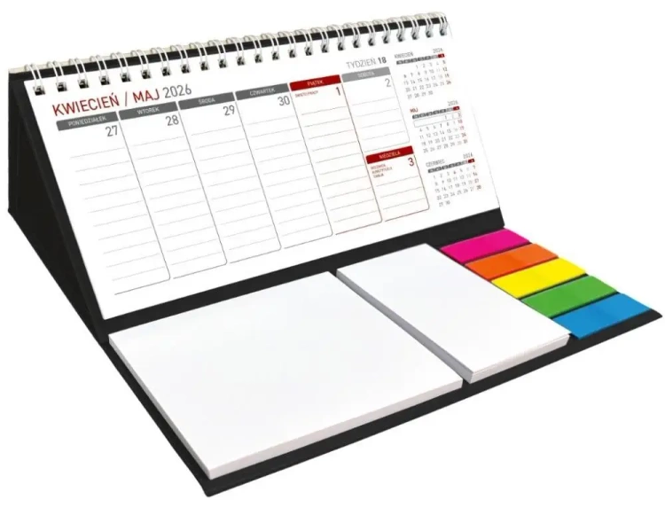 Praktyczny kalendarz stojący na biurko z przejrzystym kalendarium w układzie tygodniowym z miejscem do notowania. Poręczne samoprzylepne karteczki.