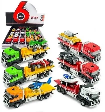 Wysokiej jakości model lawety wykonany z bezpiecznych materiałów, w zestawie z transportowanym pojazdem. Zabawka posiada napęd wsteczny (nakręcany poprzez cofnięcie). Dodatkowo laweta wyposażona jest w świecące reflektory i efekty dźwiękowe. Cena za 1szt.