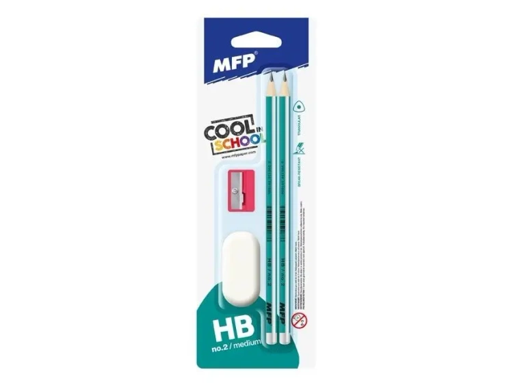 Zestaw składający się z dwóch ołówków nr 2, gumki do mazania oraz plastikowej temperówki szkolnej bez pojemnika, z jednym otworem. Zapakowane w blistrowe pudełko z zawieszką euro.