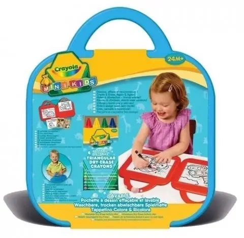 Zawiera 12 arkuszy wielokrotnego użytku , 4 zmywalne kredki trójkątne , 3 arkusze z naklejkami , całość spakowana w poręcznym opakowaniu walizeczce idealnie nadające się do rysowania w podróży