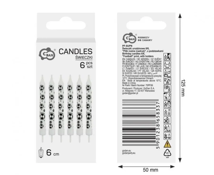 Świeczki urodzinowe Piłki nożne z podstawkami 6szt - Godan