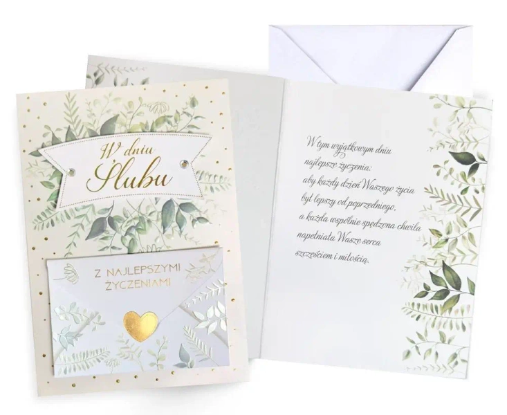 Kartka Dream Cards "W dniu ślubu" DK-1314 Kartka B6 z ozdobnej serii Dream Cards - nieduża, ale robi wrażenie dzięki atrakcyjnej kolorystyce i ciekawym zdobieniom. To idealny wybór łączący przyjazną cenę z jakością. Cechy szczególne: wielkość: B6, 16.6 x 11.7 cm po złożeniu, koperta: w zestawie, kolorowa, zdobienia: kolorowe, różnorodne, bogate (w zależności od wzoru: przyklejane dekoracje, elementy biżuteryjne, odstawniki, metaliczne folie, tłoczenia itp.), okazja: Ślub