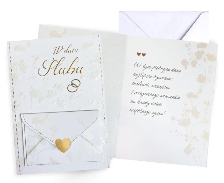 Kartka Dream Cards "W dniu ślubu" DK-1316 Kartka B6 z ozdobnej serii Dream Cards - nieduża, ale robi wrażenie dzięki atrakcyjnej kolorystyce i ciekawym zdobieniom. To idealny wybór łączący przyjazną cenę z jakością. Cechy szczególne: wielkość: B6, 16.6 x 11.7 cm po złożeniu, koperta: w zestawie, kolorowa, zdobienia: kolorowe, różnorodne, bogate (w zależności od wzoru: przyklejane dekoracje, elementy biżuteryjne, odstawniki, metaliczne folie, tłoczenia itp.), okazja: Ślub