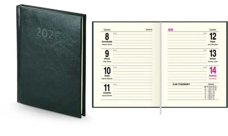 Kalendarz ma 144 strony i twardą, skóropodobną okładkę, która chroni wnętrze przed zniszczeniem, zapewniając jednocześnie elegancki wygląd. Układ środka jest niezwykle funkcjonalny cały tydzień ma swoją stronę, a cała druga strona jest poświęcona na notatki, co ułatwia organizację i planowanie.