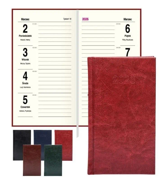 Kalendarz ma 144 strony i twardą, skóropodobną okładkę, która chroni wnętrze przed zniszczeniem, zapewniając jednocześnie elegancki wygląd. Układ środka jest niezwykle funkcjonalny cały tydzień ma swoją stronę, a cała druga strona jest poświęcona na notatki, co ułatwia organizację i planowanie.