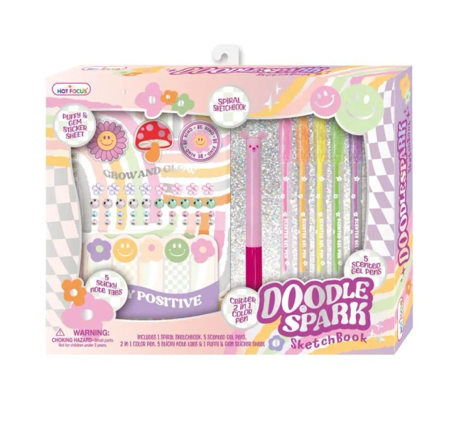 Zestaw zawiera: - kołozeszyt z czystymi kartkami - 5 długopisów żelowych - długopis tradycyjny w 2 kolorach - 3 miękkie naklejki - kryształki samoprzylepne - 5 wzorów karteczek samoprzylepnych - długopis z dwoma końcówkami - jedna to tradycyjny długopis do pisania, a druga to 'niewidzialny tusz'. Zapiski tym tuszem będą widoczne po podświetleniu ich specjalną lampką UV, która znajduje się w zatyczce długopisu - lampka LED na klips - arkusz naklejek Zestaw zapakowany w ozdobne opakowanie prezentowe. Wiek: 5+
