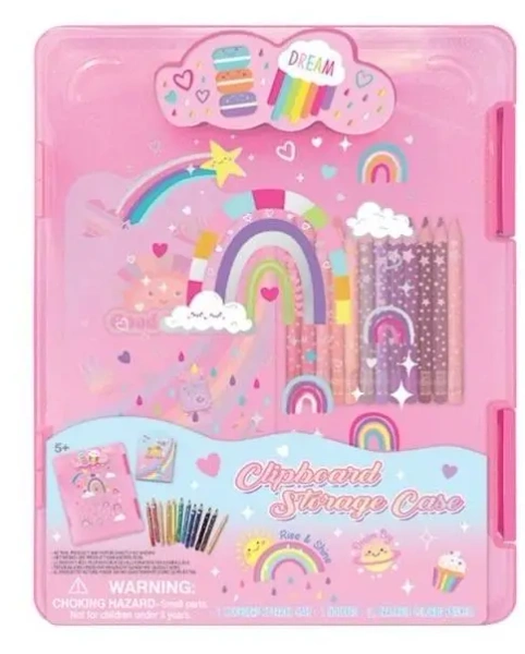 Plastikowa sztywna teczka zamykana na zatrzaski do schowania kartek, rysunków, drobiazgów czy akcesoriów do malowania. Zmieści rozmiar A4. Teczka na przodzie ma ozdobny klips, dzięki któremu można użyć jej również jako podkładki do pisania lub malowania. W zestawie 12 kolorów kredek ołówkowych oraz mini-notes z czystymi kartkami. Idealny zestaw do rozpoczęcia przygody z malowaniem dla małego artysty! Wiek: 5+