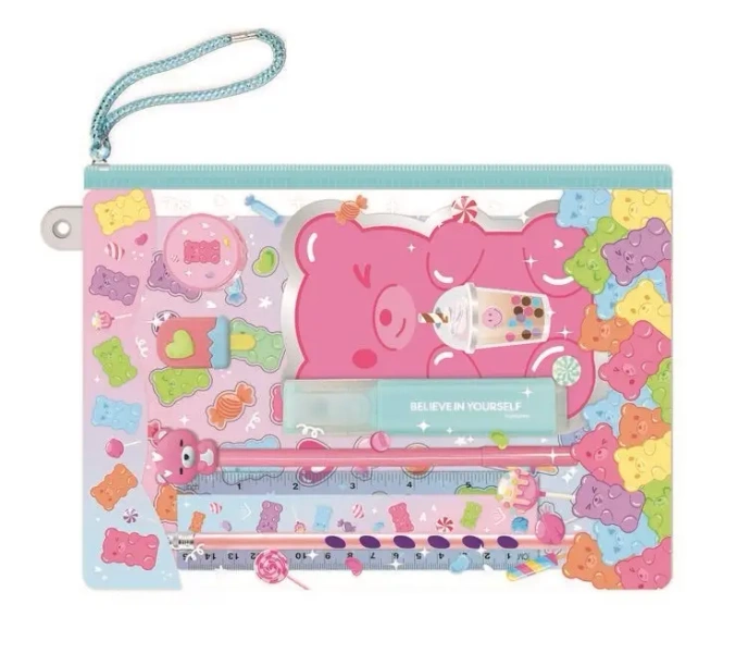 Zestaw zawiera: - notatnik z czystymi karteczkami - zakreślacz - długopis żelowy z ozdobną nakładką - ołówek - linijka - gumka do mazania - temperówka - arkusz naklejek Zestaw zapakowany w ozdobną saszetkę zamykaną na zamek z uchwytem do wygodnego przenoszenia. Wiek: 5+