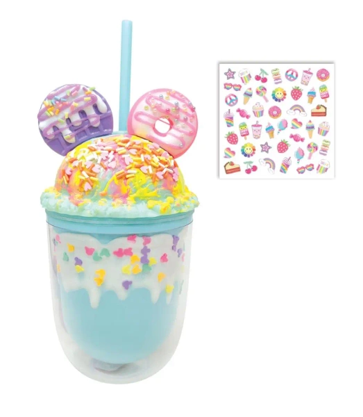 Kubek o pojemności 350ml wykonany z grubego plastiku, z podwójną ścianką dla dodatkowej ochrony. Zakręcany wypukłą nakrętką z ozdobami dzięki czemu napójsię z niego nie wyleje. Pod ścianką umieszczono kolorowe koraliki dladodatkowego dekoracyjnego efektu. Do kubka dołączona jest wielorazowa słomka oraz arkusz naklejek świecących w ciemności. Wiek: 5+