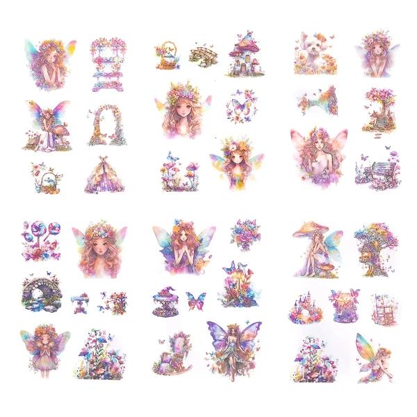 Naklejki z wysokiej jakości transparentnej folii PET z motywami baśniowych wróżek w tęczowych kolorach dla osób szukających oryginalnych i trwałych ozdób.