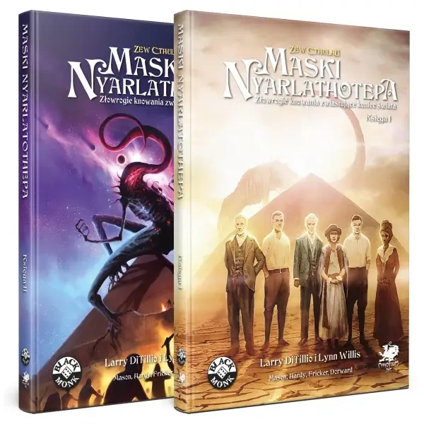 Maski Nyarlathotepa to spektakularna, wieloczęściowa kampania do Zewu Cthulhu! Badacze Tajemnic wyruszą w pełną niebezpieczeństw podróż przez sześć różnych kontynentów, by poznać prawdziwe losy zaginionej ekspedycji Rogera Carlyle’a. Dwa pięknie ilustrowane tomy wypełnione są dodatkowymi przygodami, detalami historyczno-geograficznymi i bluźnierczym okultyzmem. Kampania pozwala na poprowadzenie opowieści w klimacie klasycznego śledztwa, jak również w pulpowej wersji pełnej niespodziewanych zwrotów akcji. Niezłomni Badacze rzucą wyzwanie sługom ciemności, a od wyniku ich działań będą zależeć losy całej ludzkości!