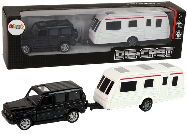 Zestaw Pojazdów Jeep Czarny Przyczepa Kempingowa Metalowe Elementy Zestaw pojazdów auto z camperem to idealny produkt dla wszystkich małych miłośników wycieczek, wyjazdów na camping, a przede wszystkim dla dzieci, które chcą odkrywać świat na własną rękę. Dzięki naszemu zestawowi Twoje dziecko może rozwijać wyobraźnię i tworzyć różne scenariusze zabawy. Wybierz się super autkiem na wycieczkę! Może wspólnie zaplanujecie trasę na najbliższe wakacje lub sprawdzicie na mapie, gdzie znajdują się miejsca na kemping ? Wygląda jak prawdziwy odpowiednik, który jeździ po drogach i każdy mały kolekcjoner może poszerzyć swoją kolekcję. Autko posiada metalowe elementy, co sprawia, że zabawka jest solidnie wykonana i z pewnością posłuży przez długi czas ! W skład zestawu wchodzi przede wszystkim samochód , który został zaprojektowany z myślą o wygodzie i komforcie jazdy, a także camper, który jest przyczepą mieszkalną. Jedną z zalet jest także napęd tylny, wystarczy pociągnąć autko do tyłu, puścić i podziwiać jak jedzie w przód. Jeep ma także otwierane drzwi, a w zestawie znajdują się karty pojazdów, które służą nauce i zabawie. Razem z przyczepą kempingową zostały bardzo dokładnie odwzorowane w stosunku do prawdziwych modeli. Całość zapakowana w estetyczny kartonik. Znakomity pomysł na prezent ! Wymiary autka: 13 cm x 5 cm x 6 cm Wymiary przyczepy kempingowej: 19 cm x 5 cm x 7 cm Wymiary opakowania: 36 cm x 10 cm x 8 cm Przeznaczona dla dzieci powyżej 3 roku życia. Zgodne z normą EN71 i certyfikatem CE.