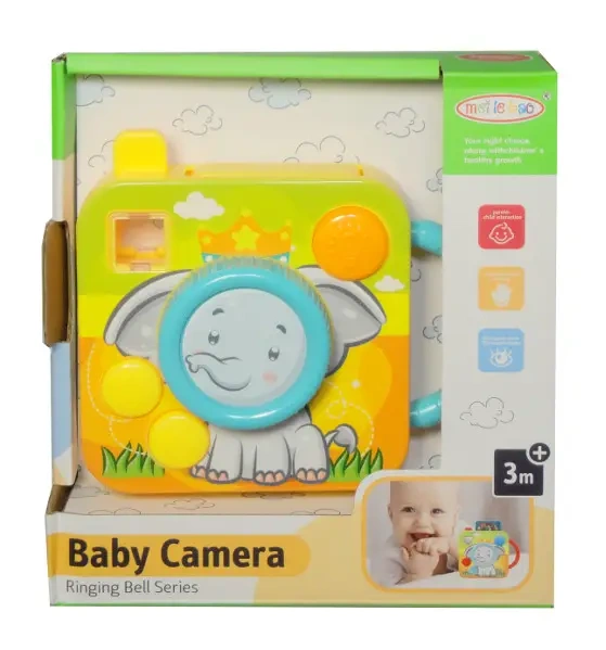 Zabawka dla najmłodszych w formie aparatu z grafiką słonika. Posiada kolorowe przyciski i elementy do obracania. Zabawka przeznaczona dla dzieci od 3 miesiąca życia. Produkt zapakowany w kartonowe pudełko. Podane wymiary są wymiarami opakowania.