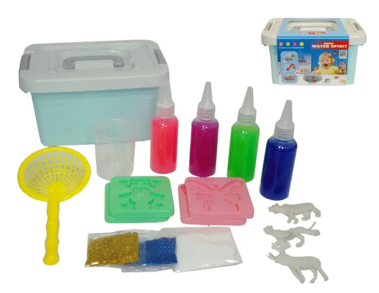Zestaw kreatywny z kolorowymi płynami, brokatem, foremkami i figurkami do zabawy w tworzenie wodnych kształtów. Produkt dla dzieci od 6 lat. Zapakowany w plastikowy pojemnik. Podane wymiary są wymiarami opakowania.
