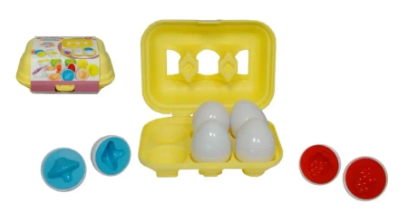 Zestaw edukacyjny składający się z plastikowych jajek i żółtego pudełka. Wewnątrz jajek znajdują się kolorowe kształty do dopasowywania. Zapakowany w kartonową nakładkę. Podane wymiary są wymiarami opakowania.