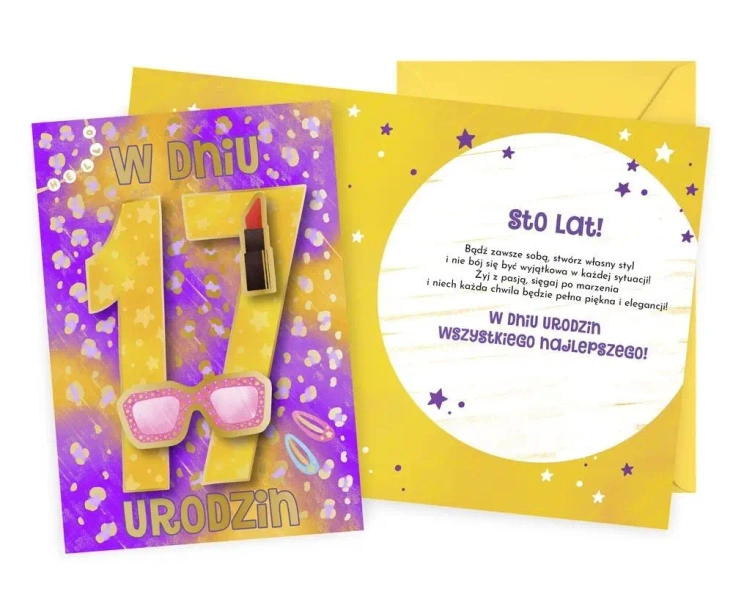 Kartka Dream Cards "W dniu 17 urodzin" DK-1272 Kartka B6 z ozdobnej serii Dream Cards - nieduża, ale robi wrażenie dzięki atrakcyjnej kolorystyce i ciekawym zdobieniom. To idealny wybór łączący przyjazną cenę z jakością. Cechy szczególne: wielkość: B6, 16.6 x 11.7 cm po złożeniu, koperta: w zestawie, kolorowa, zdobienia: kolorowe, różnorodne, bogate (w zależności od wzoru: przyklejane dekoracje, elementy biżuteryjne, odstawniki, metaliczne folie, tłoczenia itp.), okazja: urodziny