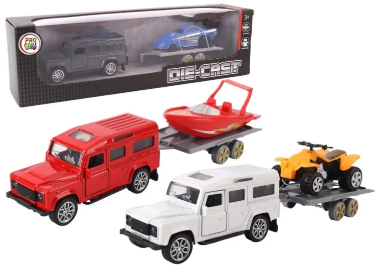 Pojazd główny terenówka z solidną, metalową karoserią zachwyca detalami i trwałością. Dzięki napędowi typu pull-back i otwieranym drzwiom zaprasza do wielokrotnych scenariuszy zabawy: załadunku, transportu i akcji ratunkowej. Przyczepa, mocowana na zaczep, mieści jedną z trzech wersji ładunków sportową łódź, kolorowego quad lub aerodynamiczny samochód wyścigowy każdy z nich stylizowany z dbałością o najmniejsze szczegóły.