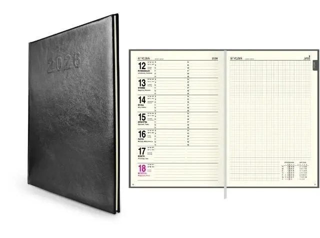 Kalendarz ma 112 strony i twardą, skóropodobną okładkę, która chroni wnętrze przed zniszczeniem, zapewniając jednocześnie elegancki wygląd. Układ środka jest niezwykle funkcjonalny cały tydzień ma swoją stronę, a cała druga strona jest poświęcona na notatki, co ułatwia organizację i planowanie.