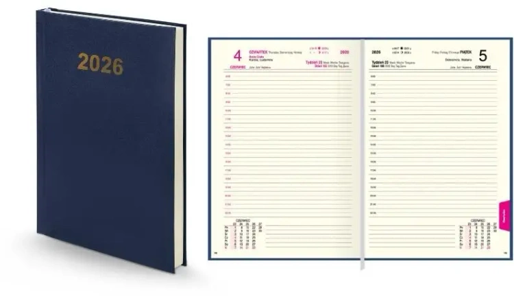 Zaprezentuj swój profesjonalizm z naszym klasycznym Terminarzem dziennym A5 na 2026 rok. Ten wyjątkowy kalendarz został zaprojektowany z myślą o tych, którzy cenią sobie pragmatyzm i minimalizm, jednocześnie nie rezygnując ze stylu. Jego prosta, ale elegancka estetyka idealnie komponuje się z każdym środowiskiem pracy i stylem życia.