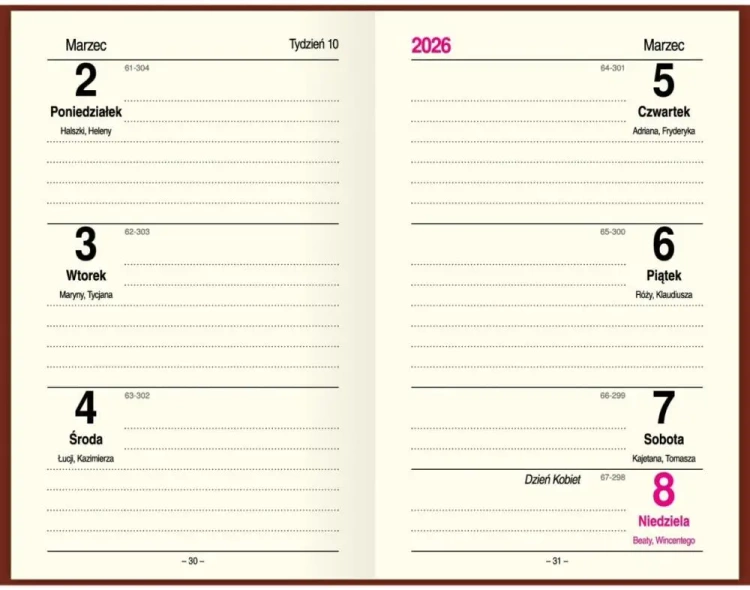 - Część informacyjna: strony na notatki, telefony kierunkowe, skorowidz alfabetyczny, daty imienin i Świąt.