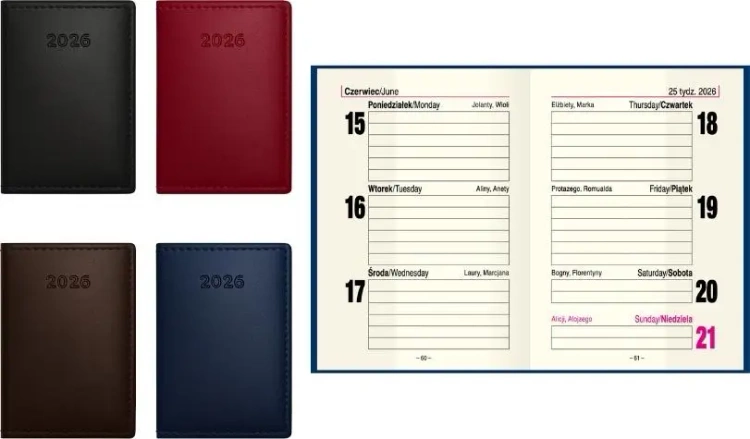 - Część informacyjna: strony na notatki, telefony kierunkowe, skorowidz alfabetyczny, daty imienin i Świąt.