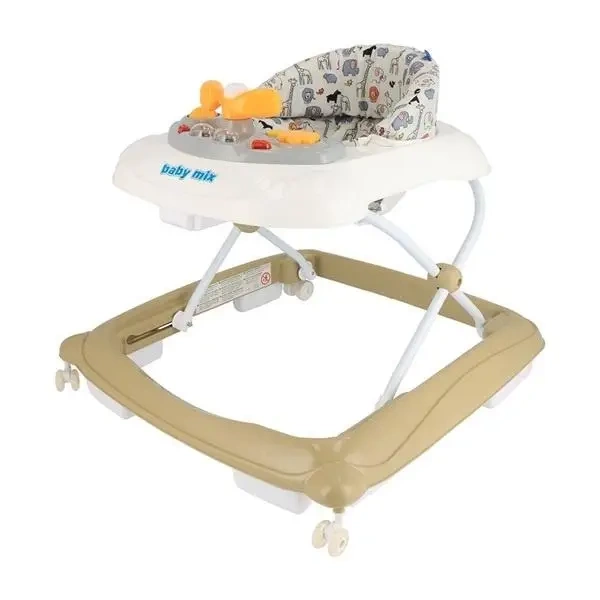Multifunkcyjny chodzik dziecięcy Baby Mix z silikonowymi kółkami ułatwia naukę chodzenia. Chodzik został wyposażony w wygodne, specjalnie wyprofilowane siedzonko które zapewnia odpowiednią postawę dla kręgosłupa. Wielofunkcyjny panel zabawowy: z efektami świetlnymi, kierownicą z klaksonem, którą można obracać, kwiatek, grzechotkę, dwa przyciski, które grają melodie i dwa światełka. Piękny chodzik z zabawkami oczaruje małych odkrywców i pozwoli im bawić się jeszcze dłużej. Jeździk został wyposażony w specjalny system zabezpieczający przed wywrotką, który zapewni komfort i bezpieczeństwo maluchowi. Zgodność z normą EN-1273:2020 dotyczącą bezpieczeństwa chodzików dziecięcych. Bezpieczna i funkcjonalna zabawka dla Twojego malucha. CHARAKTERYSTYKA PRODUKTU: - Dla maluchów od 6 miesiąca życia - Wielofunkcyjny panel zabawowy z dwoma pokrętłami i efektami świetlnymi, 12 grających melodyjek, klakson z obrotową kierownicą (zasilany bateriami 2x1,5 V AA - baterie nie są dołączone) - 3 stopniowa regulacja wysokości - Pozycje ustawienia wysokości w zależności od wzrostu dziecka - Możliwość prania poszycia siedziska - 2 silikonowe skrętne koła przednie, obrotowe kółka 360, które nie rysują podłogi - 2 gumowe stałe koła w tyle dla zapewnienia większego bezpieczeństwa - Specjalny system zabezpieczający przed wywrotką WYMIARY PRODUKTU: - Konstrukcja pozwala na regulację wysokości od 40cm do 44cm oraz na złożenie jeździka do małych rozmiarów - Wysokość: 40-44 cm - Szerokość: 50 cm - Głębokość: 50 cm - Maksymalne obciążenie do 12 kg - Waga: 3,9 kg OPAKOWANIE: 62x64x12,5 cm Waga z opakowaniem: 4,1 kg