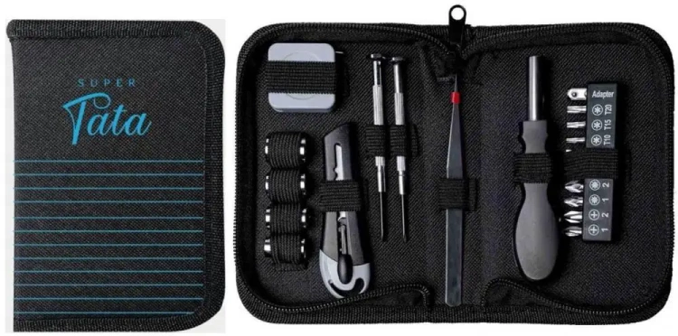Zestaw majsterkowicza "Super Tata" Kompaktowy, poręczny i niezwykle funkcjonalny - zawiera aż 11 elementów, w tym kombinerki, latarkę, wkrętak z końcówkami, nożyk, klucze imbusowe, przedłużkę oraz uchwyt do bitów. Całość zamknięta w eleganckim etui o wymiarach 155 100 35 mm. Idealny zestaw dla każdego taty, który lubi być przygotowany na każdą okazję.