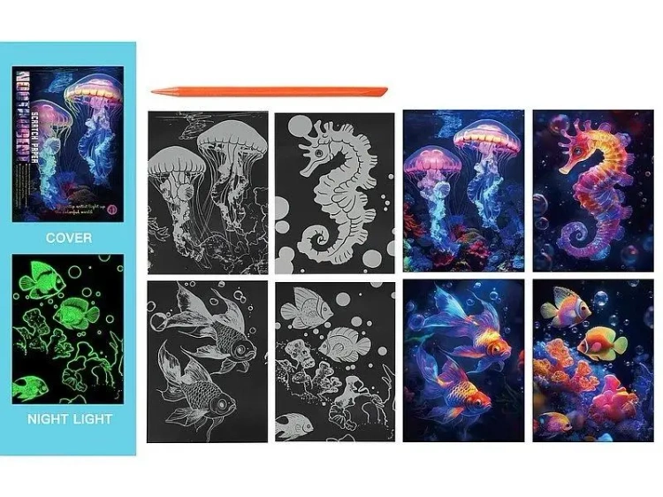 wydrapywanka kolorowa fluo, świeci w nocy, morskie zwierzęta; 32x25x0,2cm, PPB