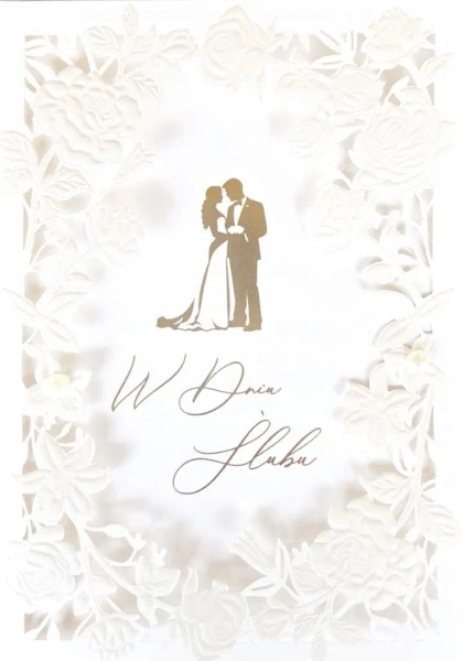Elegancki karnet na Ślubny w formacie B6 z laserowo wycinanym wzorem. Delikatny, ażurowy motyw z symbolami ślubnymi. Wewnątrz miejsce na życzenia. Idealna pamiątka tego ważnego dnia.