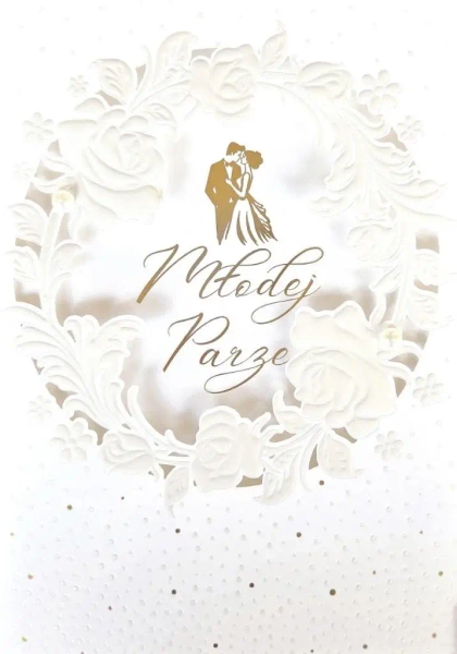 Elegancki karnet na Ślubny w formacie B6 z laserowo wycinanym wzorem. Delikatny, ażurowy motyw z symbolami ślubnymi. Wewnątrz miejsce na życzenia. Idealna pamiątka tego ważnego dnia.
