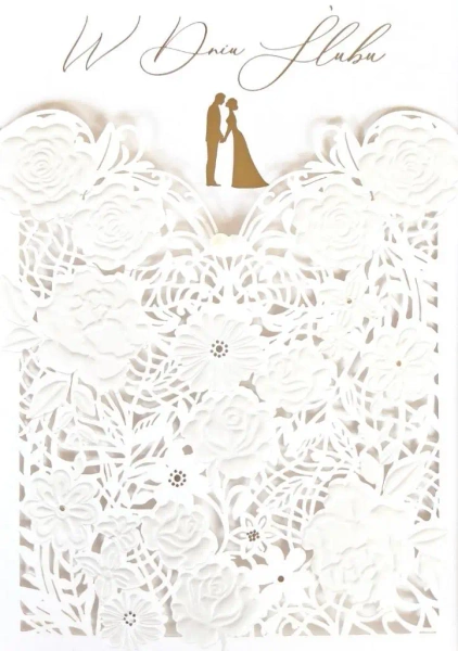 Elegancki karnet na Ślubny w formacie B6 z laserowo wycinanym wzorem. Delikatny, ażurowy motyw z symbolami ślubnymi. Wewnątrz miejsce na życzenia. Idealna pamiątka tego ważnego dnia.