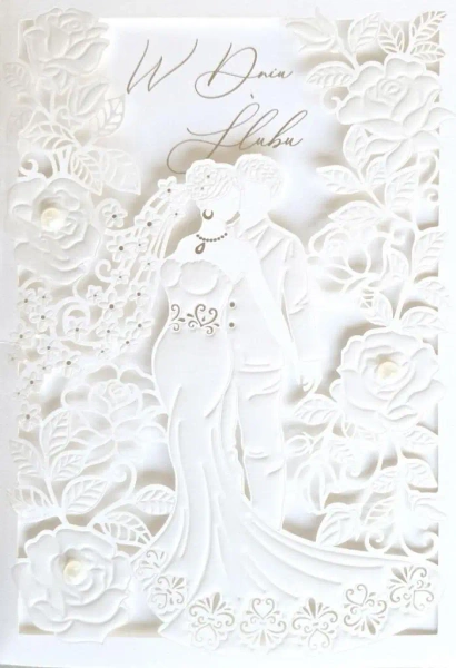 Elegancki karnet na Ślubny w formacie B6 z laserowo wycinanym wzorem. Delikatny, ażurowy motyw z symbolami ślubnymi. Wewnątrz miejsce na życzenia. Idealna pamiątka tego ważnego dnia.